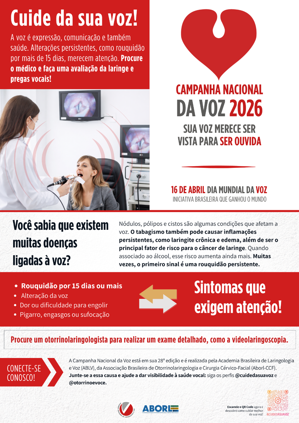 Em comemoração ao Dia Mundial da Voz, celebrado em 16 de abril, hospitais e clínicas inscritos na Campanha Nacional da Voz, realizam exames gratuitos de videolaringoscopia. O exame tem o objetivo de diagnosticar doenças da laringe, principalmente o câncer. A ação é organizada pela Academia Brasileira de Laringologia e Voz (ABLV), em parceria com a Associação Brasileira de Otorrinolaringologia e Cirurgia Cérvico-Facial (ABORL-CCF), Sociedade Brasileira de Fonoaudiologia, e iInstituições, públicas e privadas.